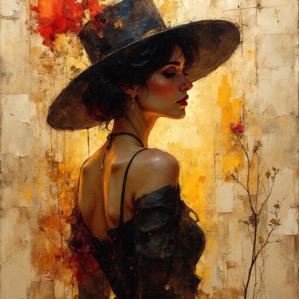 This image shows a breathtakingly beautiful silhouette against a detailed backdrop. The artwork is reminiscent of encaustic painting with earth tones and impressionistic elements.