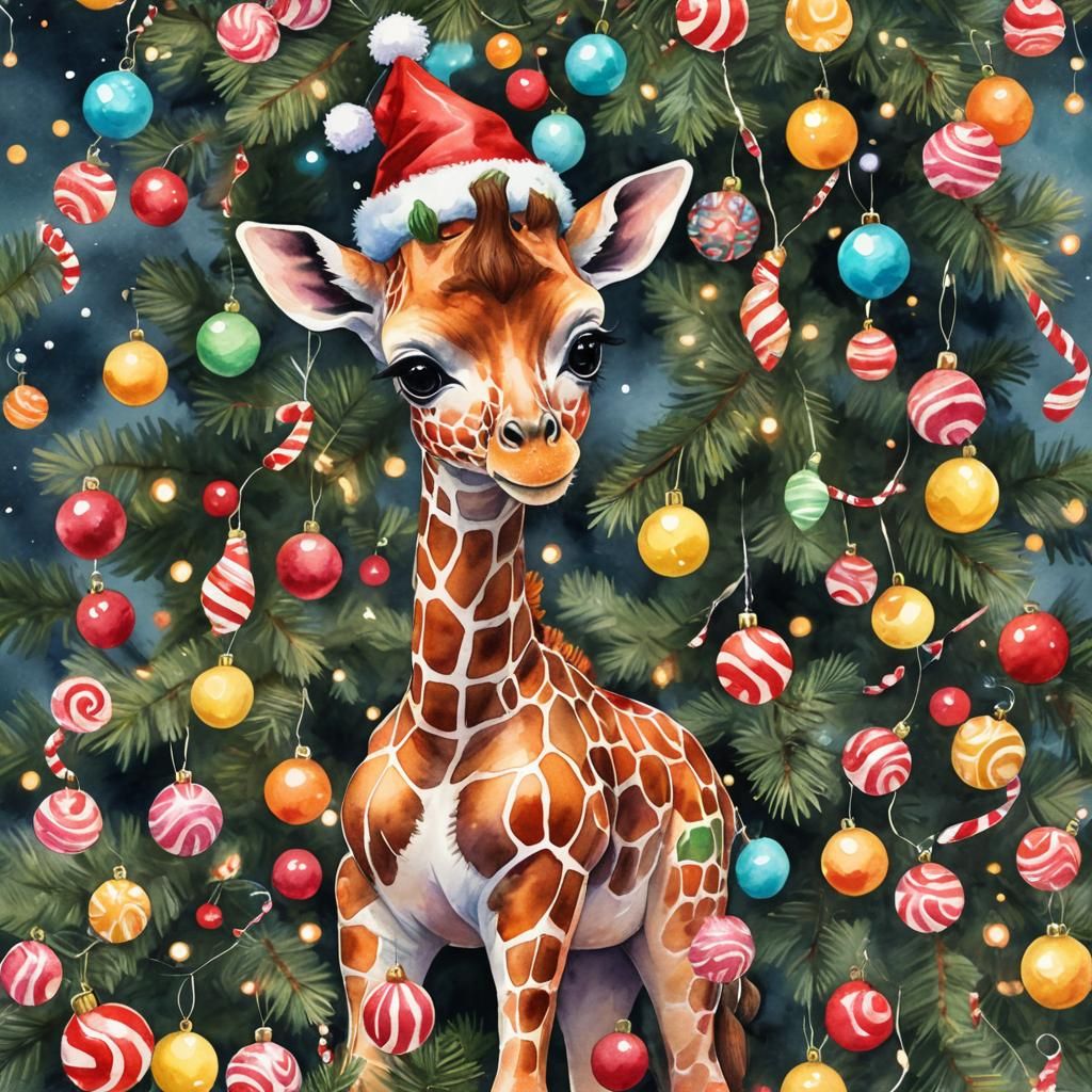A charming watercolor image of a baby giraffe in a Santa hat decorating a Christmas tree. The artwork has a candyland art style with vibrant colors and dynamic lighting.