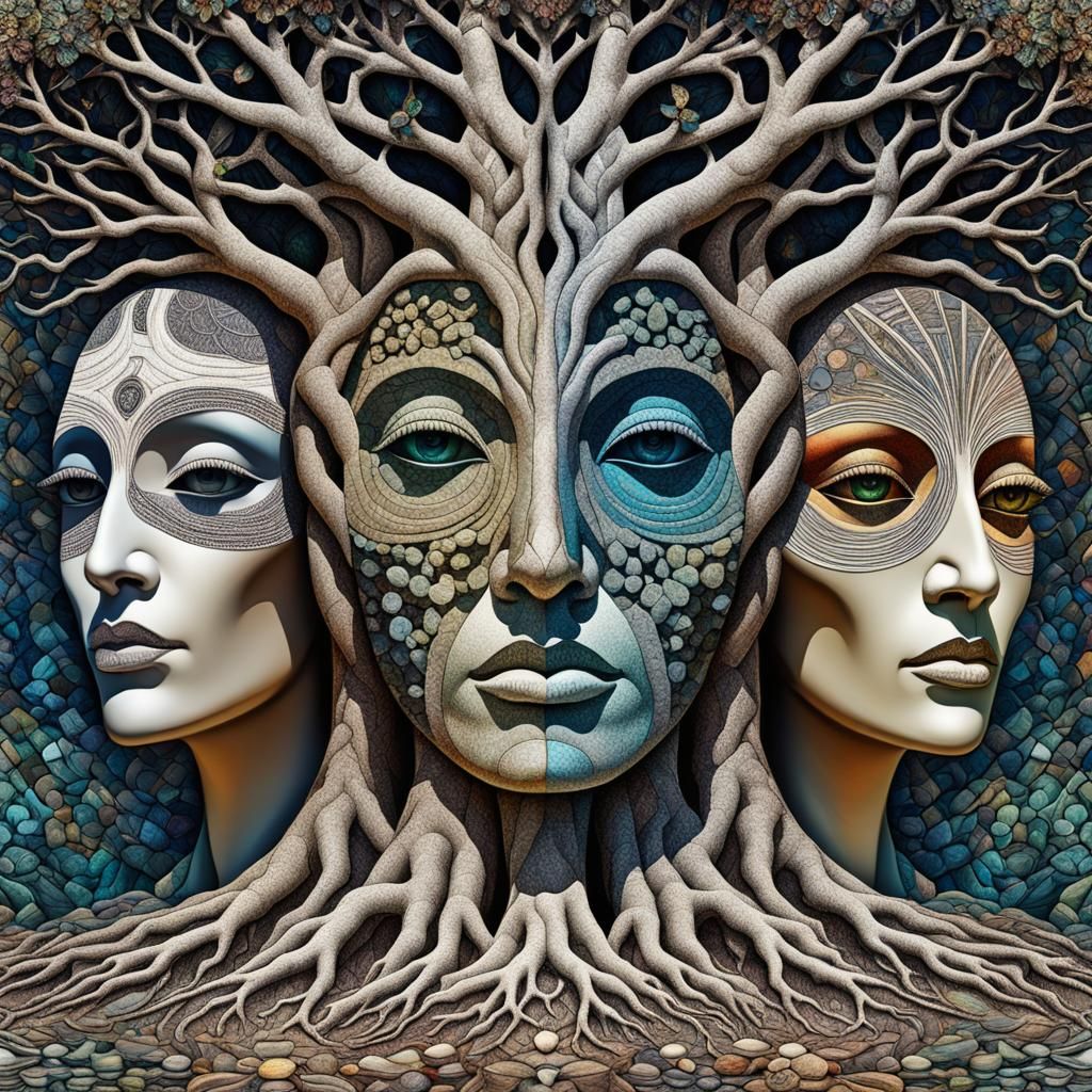 A striking picture of a surreal stone tree person portrait with mirrored curves and ivory skin. Deep, vibrant colors across the EM spectrum create a hyperdetailed collage effect.