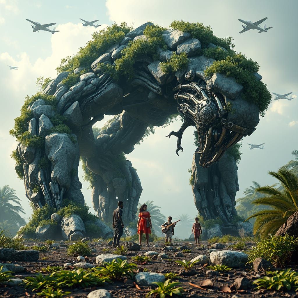 This image shows a gigantic, biomechanical being made of rock and plants, sheltering children from bombs. The artwork is reminiscent of futuristic sci-fi art, with polished metal details and dramatic lighting.