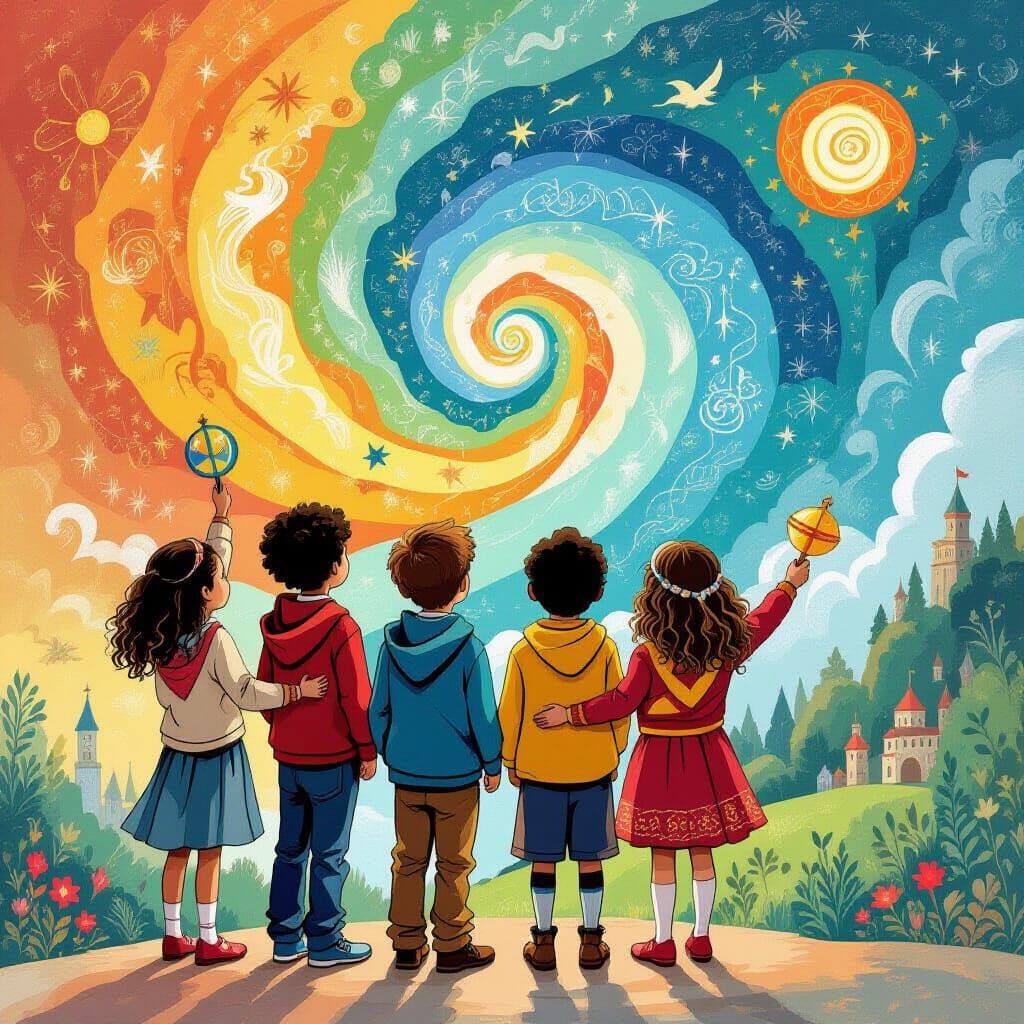 This image shows diverse children holding symbolic objects with a vibrant background. The artwork is reminiscent of early Harry Potter book covers, featuring intricate and whimsical illustrations.