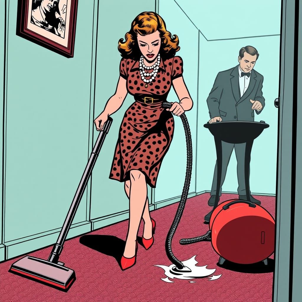 This image shows a 1950s housewife vacuuming in stylish heels and pearls, blending domesticity with elegance