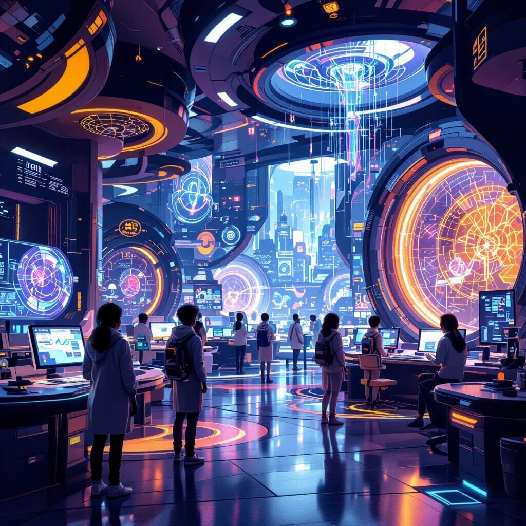 This image depicts a vibrant, futuristic school where young innovators use AI and digital tools. It showcases advanced technology and creativity, rendered with dynamic lighting and a bold color scheme.