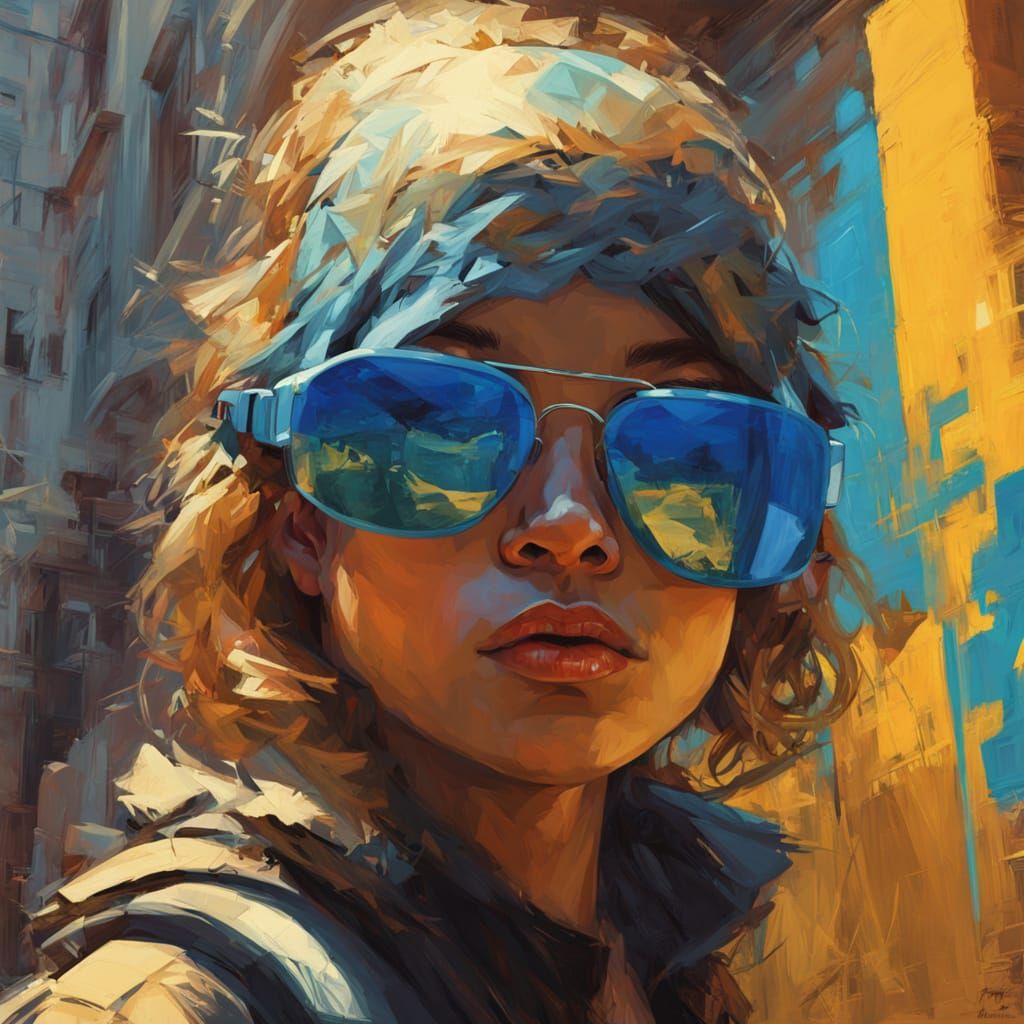 This image shows a full-color painting of a girl with wavy auburn hair and blue sunglasses, set against a yellow brick wall. The artwork is highly detailed with a graffiti art style.