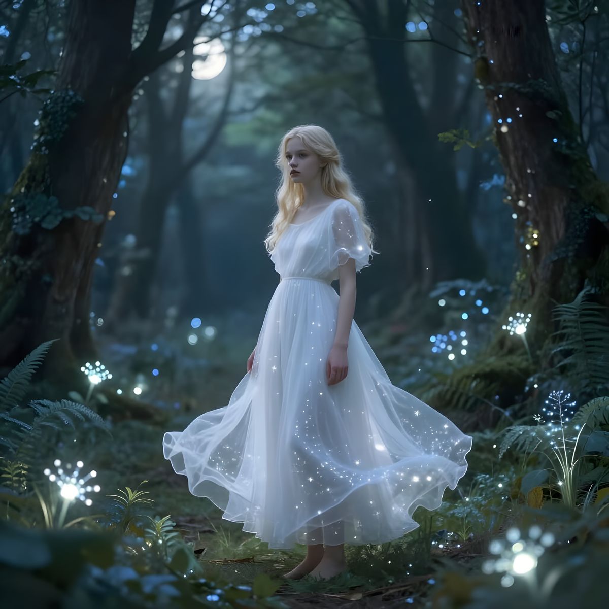 A serene blonde girl in a shimmering white dress stands in a glowing forest under soft moonlight. Bioluminescent plants create dappled light patterns, evoking fantasy concept art.