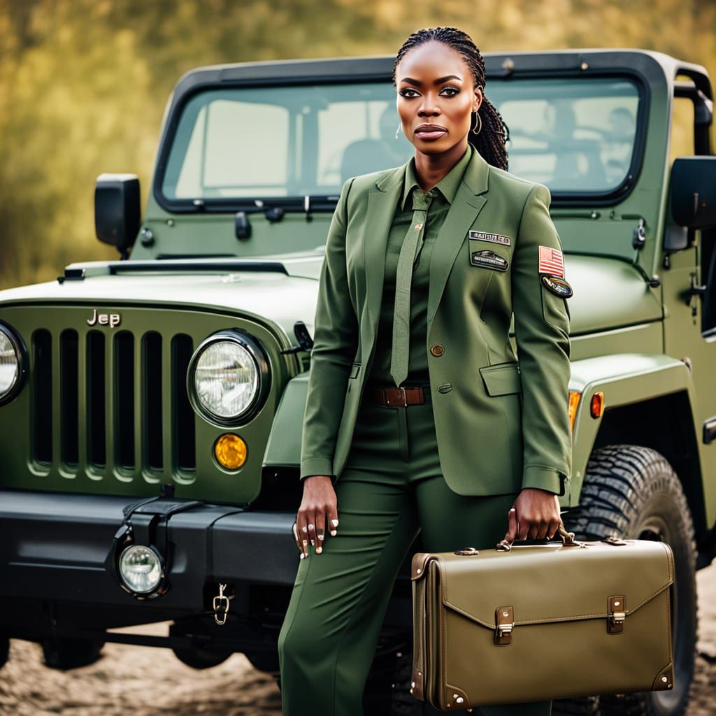 This image shows a stylish Black woman in a military-green suit holding a briefcase, standing by a sports jeep. The photograph uses vibrant colors, studio lighting, and a shallow depth of field.