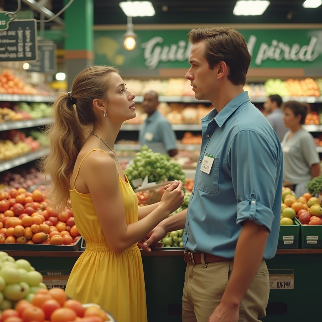 A hyperrealistic image of a gossiping woman holding up the express lane in a busy grocery store. The photorealistic style captures the textures and vibrant colors of the scene.