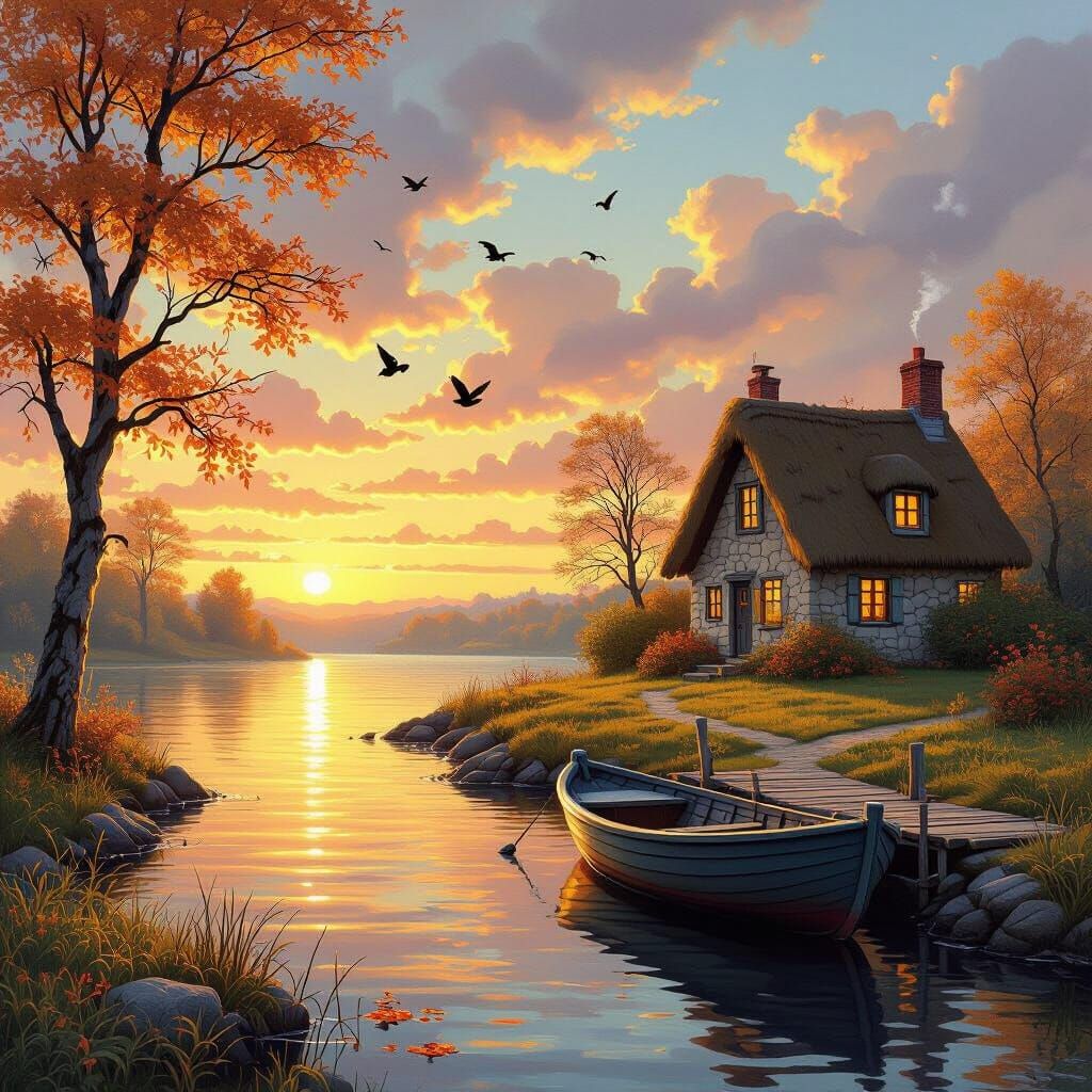 This image shows a dreamlike fantasy illustration of an autumn landscape. A cottage sits by a stream and dock with a boat, under a sunset sky with birds.