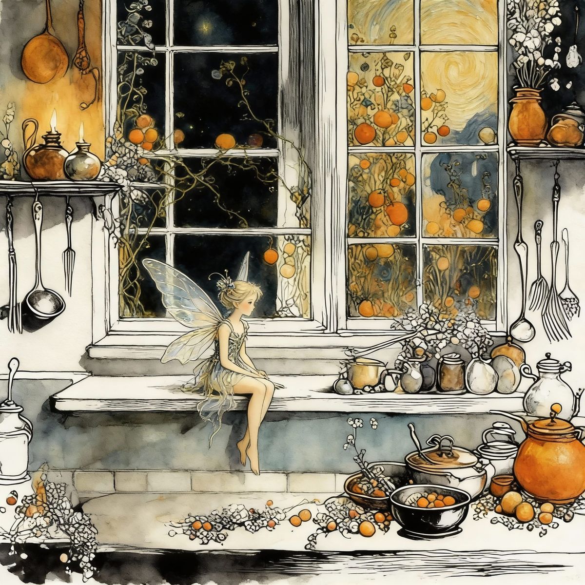 This image showcases a tiny, intricate fairy on a kitchen windowsill, surrounded by detailed vines. Rendered with hyperrealistic detail and vibrant colors, it evokes a sense of fantasy and magic through its cinematic lighting and deep focus.