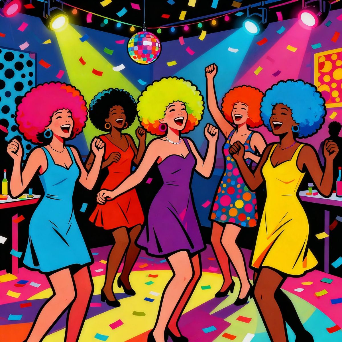 This image shows a lively group of women with vibrant, oversized party wigs, dancing and laughing amidst confetti and colorful lights. The illustration captures pure joy in a pop art style with bold colors.