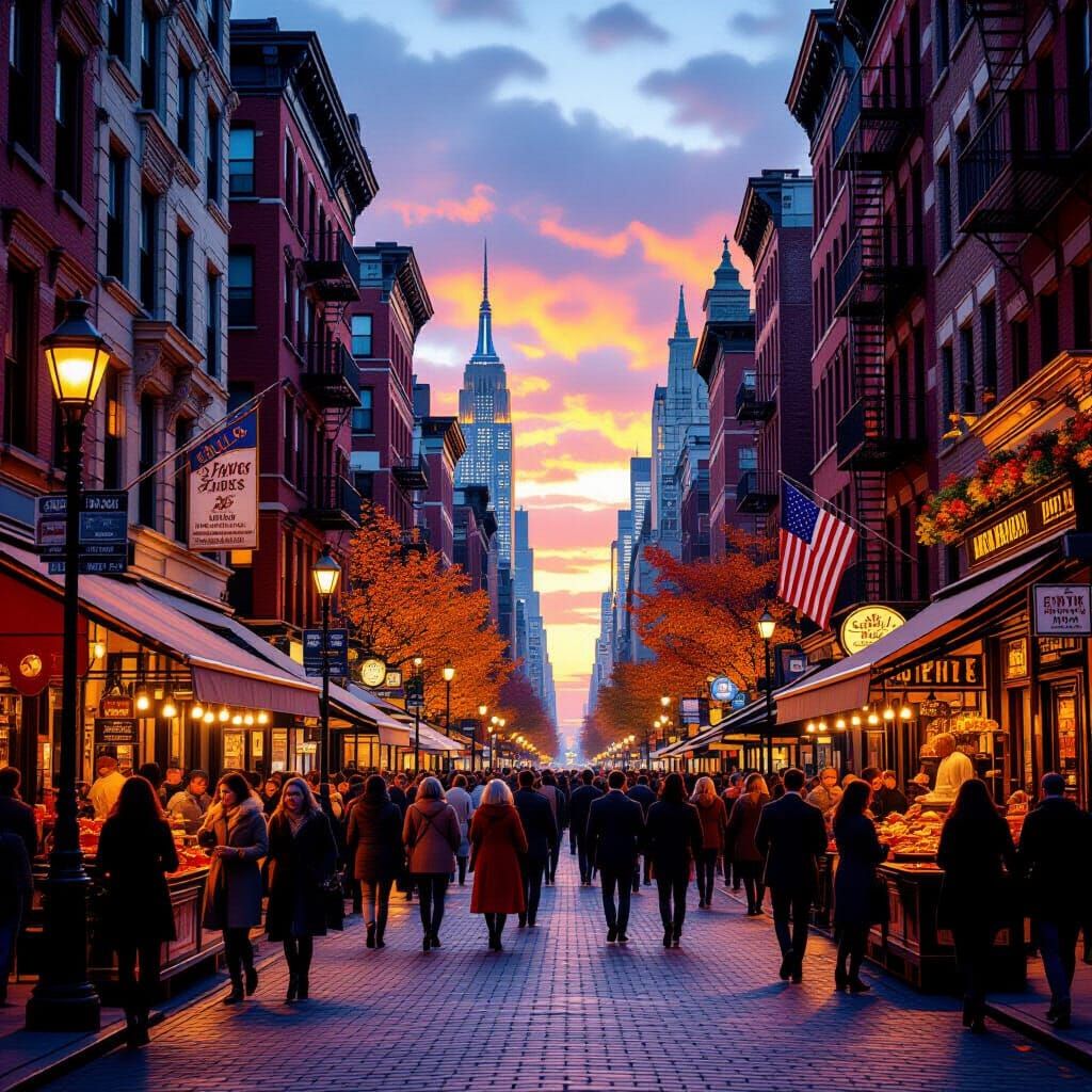This photorealistic image captures a lively New York City street during an autumn festival. Elegant people enjoy food and music under a warm, vivid evening sky, with cinematic lighting.