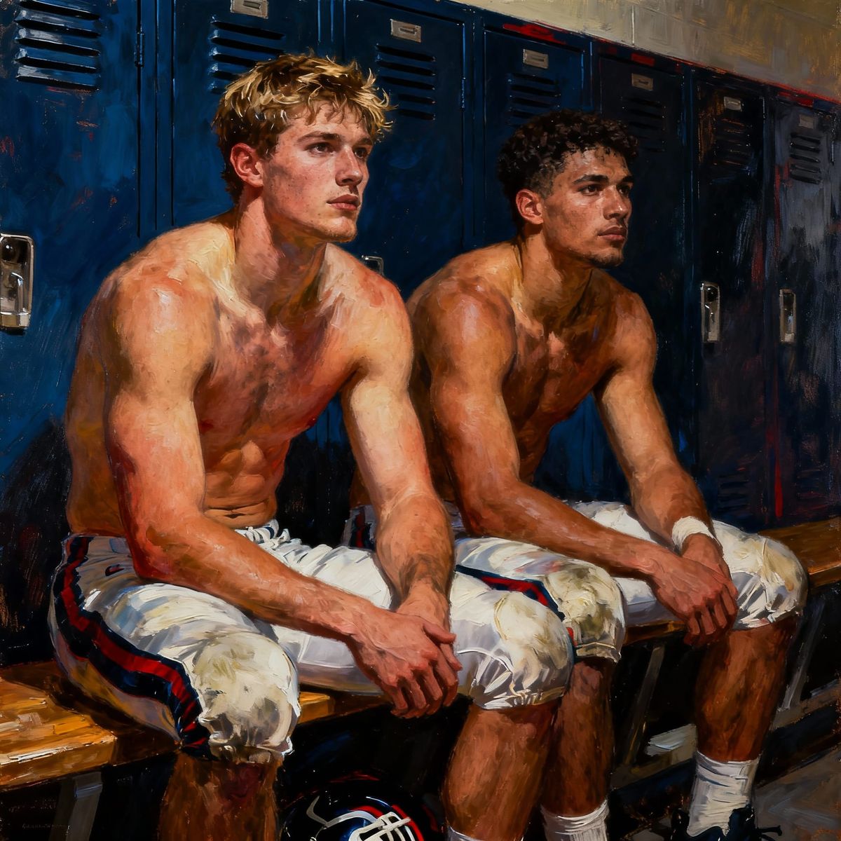 This image shows two muscular college football players resting on a locker room bench after a game. The scene features dramatic lighting and rich textures, captured in a highly detailed photographic style.