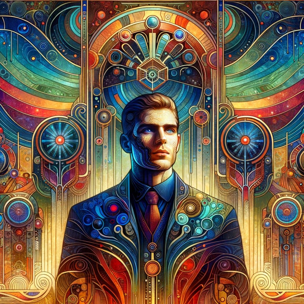This image shows a vintage science fiction book cover featuring a man. The artwork is mystical, vibrant, and intricate, reminiscent of late 19th-century Symbolism and Art Nouveau.