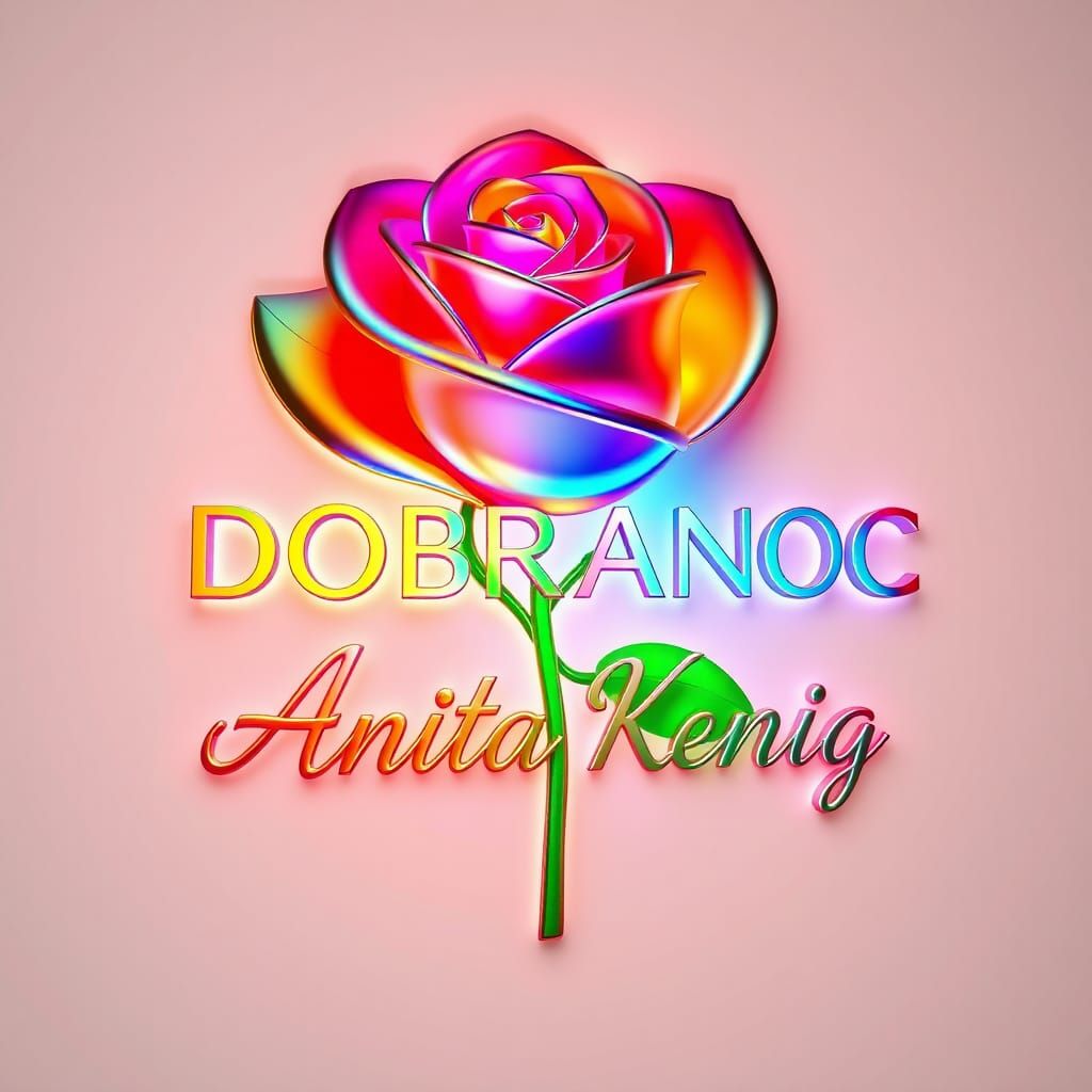 A striking picture of a 3D logo design. It features a rainbow rose with gold-edged leaves and the name "DOBRANOC Anita Kenig" in a glowing font, set against a white backdrop as futuristic digital art.