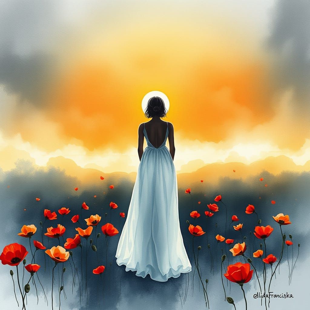 A breathtaking sunrise painting during a foggy winter morning. The artwork features a calm poppy field with ethereal mist and a female figure in a translucent white dress. Created as an ink-alcohol water-wash painting.