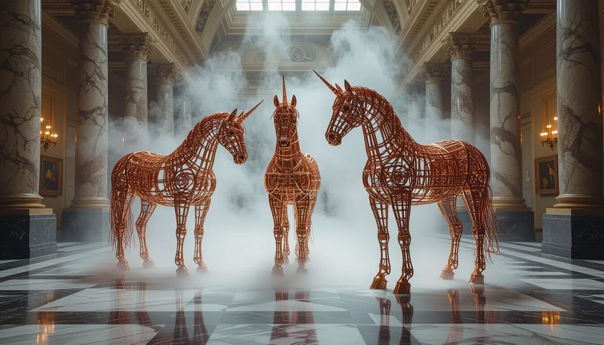 A striking picture of three translucent horses crafted from copper wire, standing peacefully in a softly lit museum. The image captures a hyperdetailed fantasy aesthetic, with ethereal mist and marble floors.