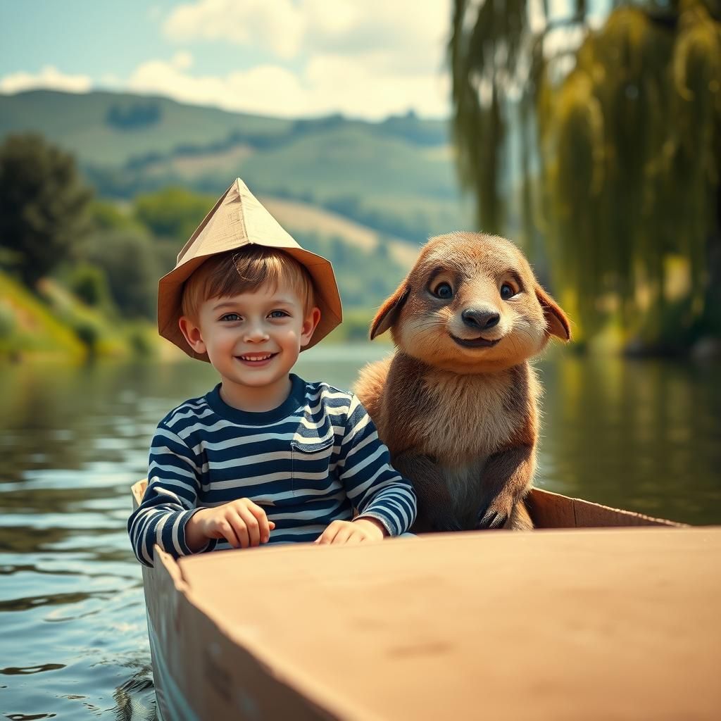This image shows a boy and his imaginary friend sailing down a river in a cardboard box. The landscape evokes a sense of nostalgia, reminiscent of Provia film stock with earthy tones.