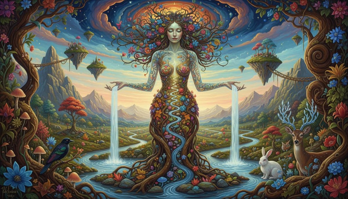 This image shows a surreal depiction of Mother Nature merging with a vibrant landscape. Waterfalls flow from her hands, surrounded by organic elements and gentle animals, in a dreamlike, symbolic style.