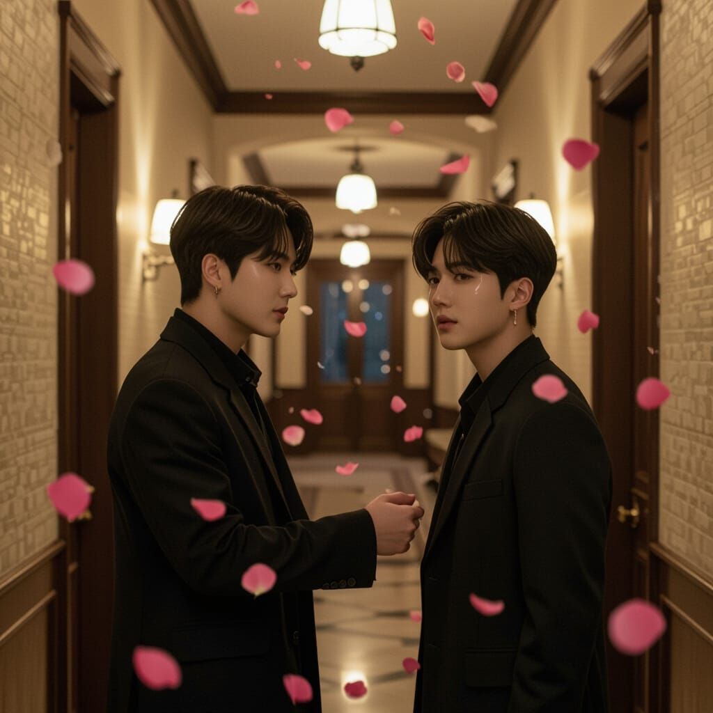 This image shows Kim Taehyung and Jeon Jungkook in a dramatic K-drama scene. Soft lighting and falling flower petals enhance the romantic tension and heartbreaking atmosphere in a luxurious Korean house.