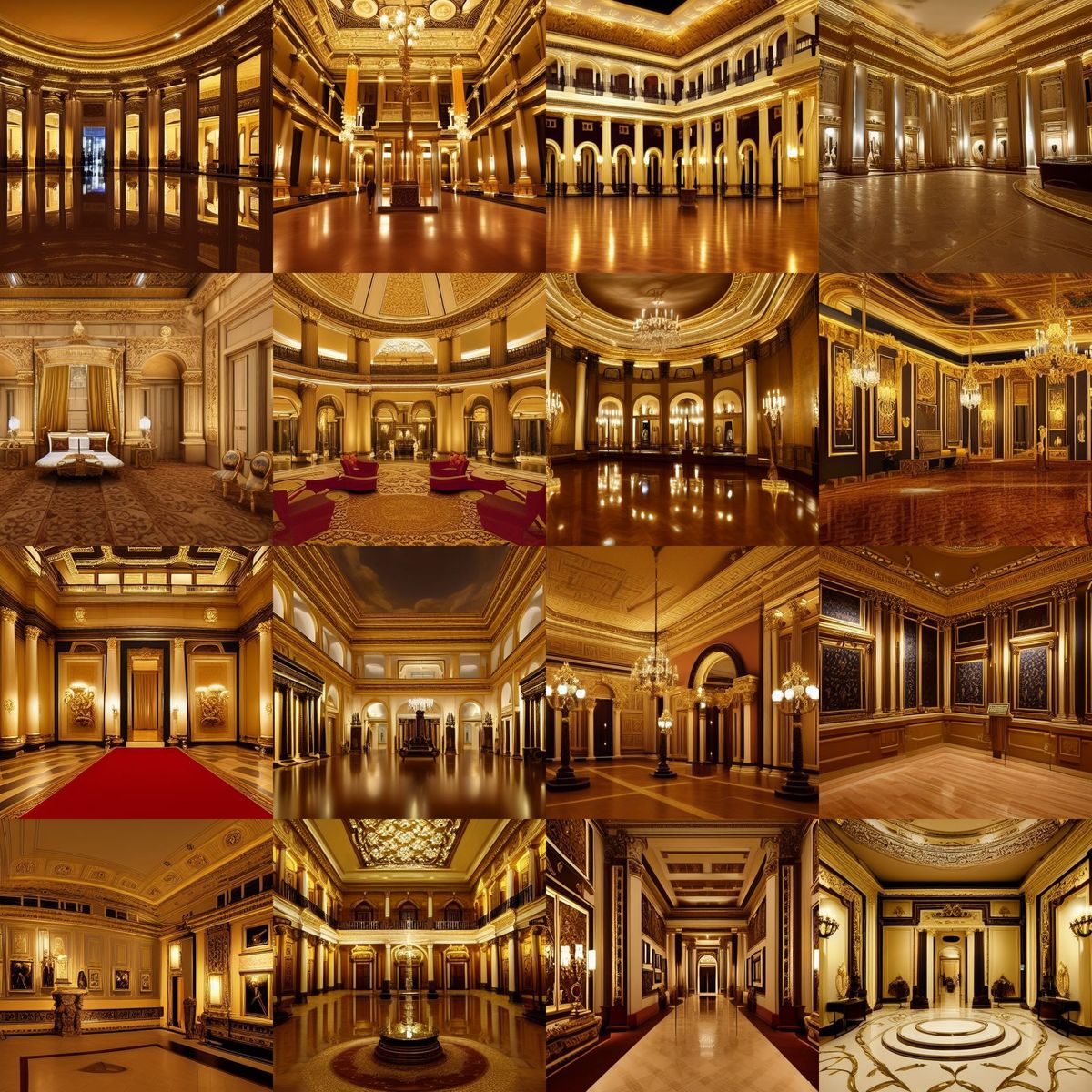 This image shows the interior of a lavish classical museum at night, filled with intricate and ornate decorations. The scene exudes an atmosphere of grandeur and opulence.