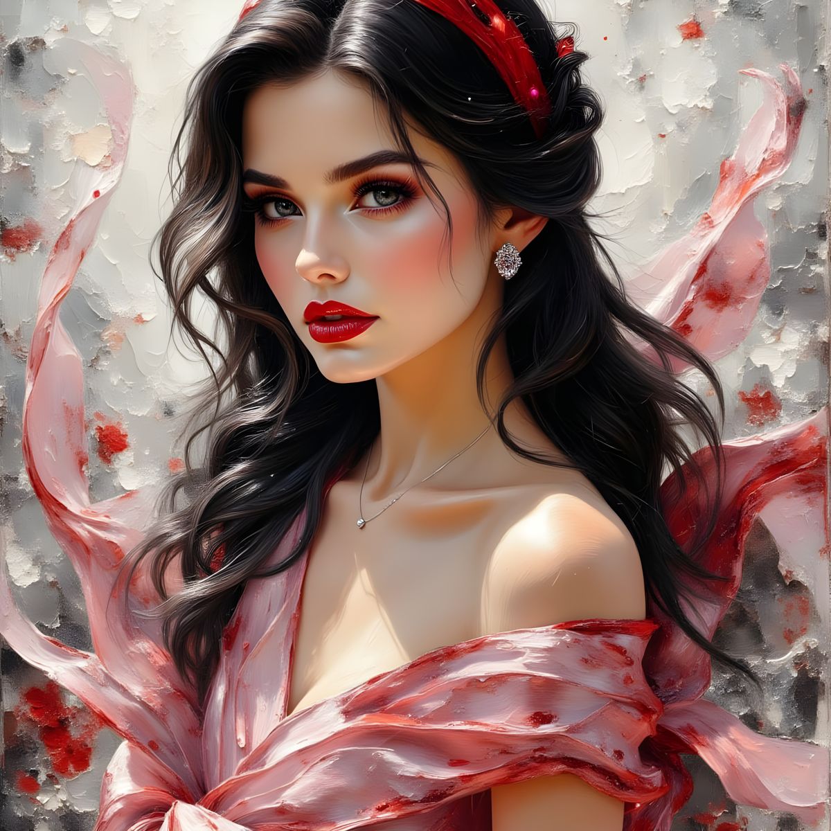 A portrait of an elegant lady with dark hair and scarlet accents, rendered in a heavily textured impasto style with thick, expressive brushstrokes and magical lighting. The art captures refined beauty with flowing contours and a dynamic pose.