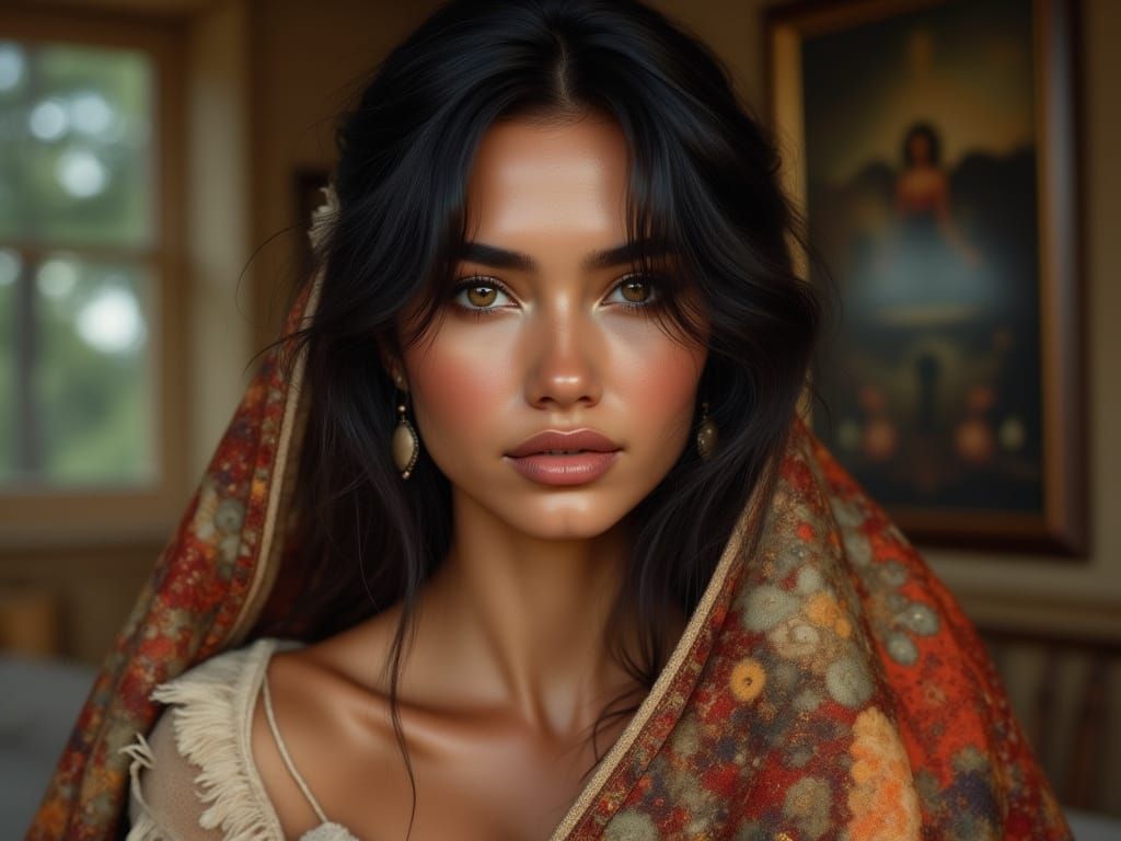 This image shows a Native American woman with porcelain skin and jet-black hair draped in a colorful cotton sheet. Soft, natural lighting accentuates her features in this sensual portrait.