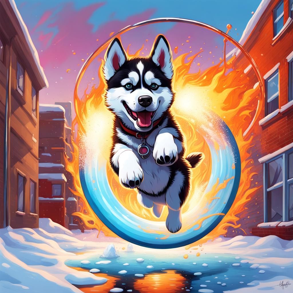 A vibrant graffiti art image featuring a husky puppy leaping through a fiery hoop. The puppy lands in a pool of crystalline snow, set against a school backdrop in a colorful polychromatic style.
