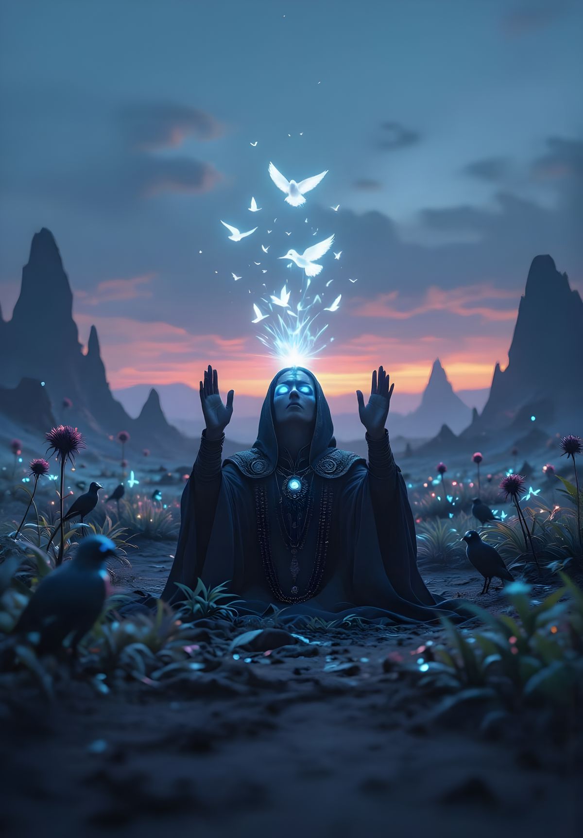 This image shows an alien landscape at dawn with strange, glowing plants and creatures. A central figure in regal attire prays, with radiant light emanating from their hands and ethereal birds taking flight.