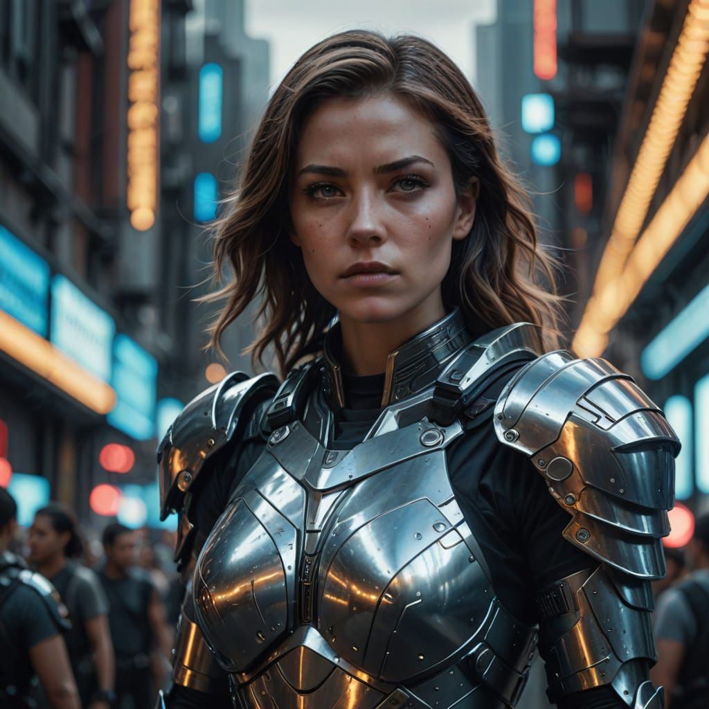 This digital matte painting features a female warrior in detailed futuristic armor. The artwork captures a cinematic film still with a vintage, atompunk aesthetic and dramatic lighting.