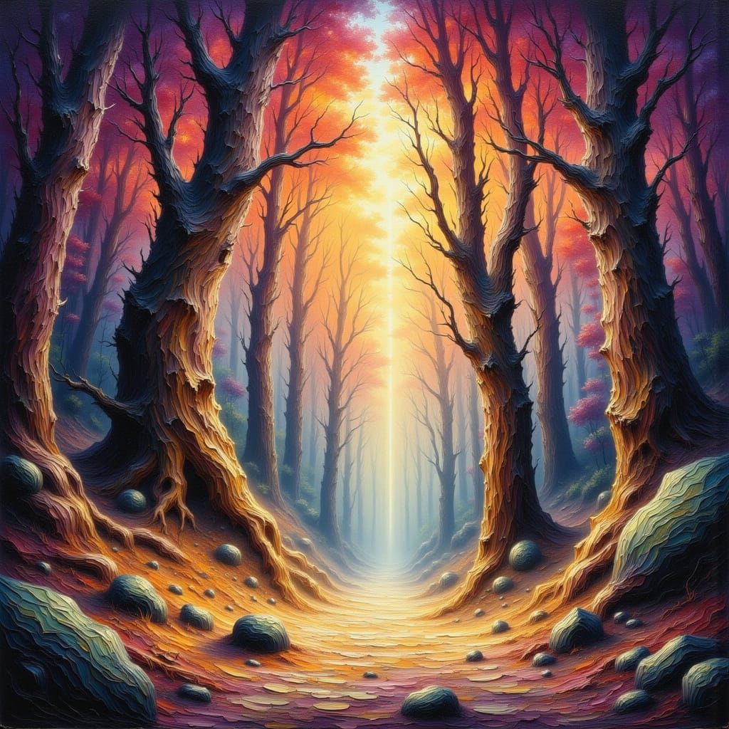 This image shows ancient trees fossilized into stone, bathed in luminous, dreamlike light and saturated colors. The scene evokes natural wonder with a magical realism feel, rendered with a painterly, textural technique.