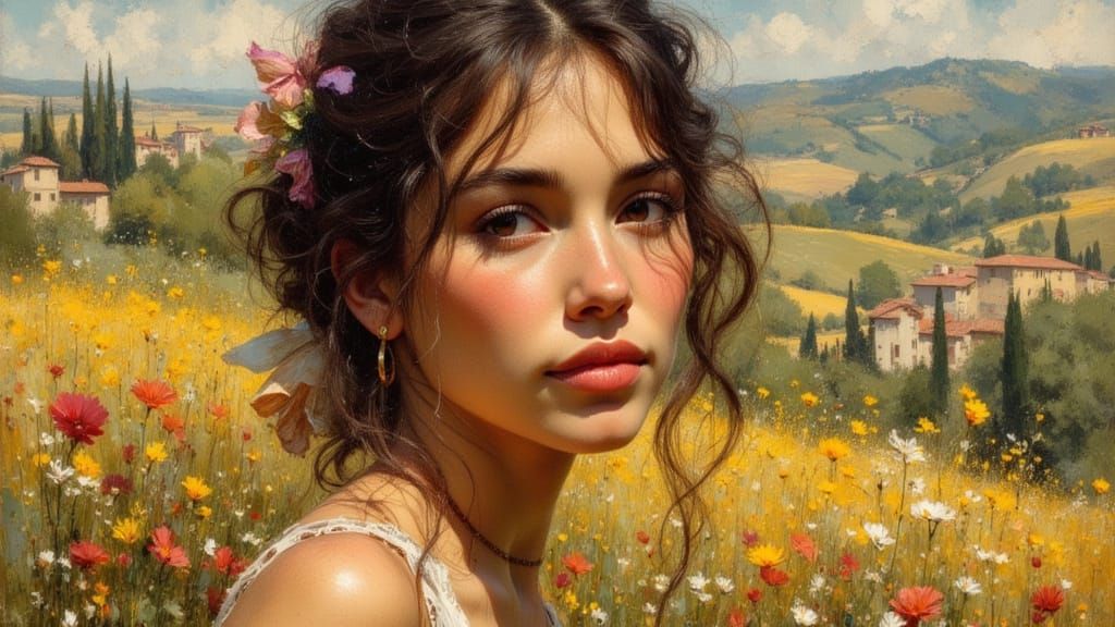 This AI generated image features a detailed portrait of a woman in Tuscany, rendered with dynamic lighting and vibrant colors in a concept art style.