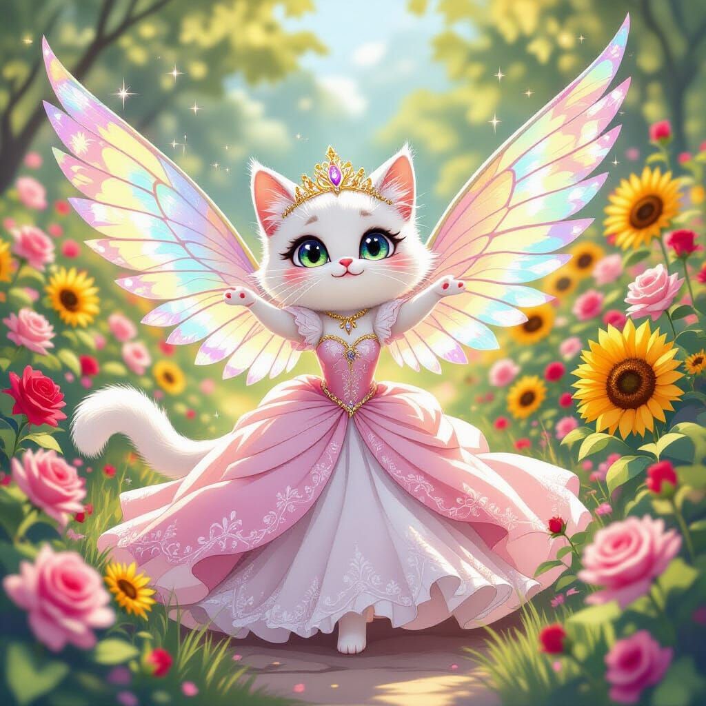 This image shows a white cat with fairy wings taking flight. The cat is wearing a pink gown and tiara, and is flying through a vibrant flower garden in a watercolor and digital painting style.