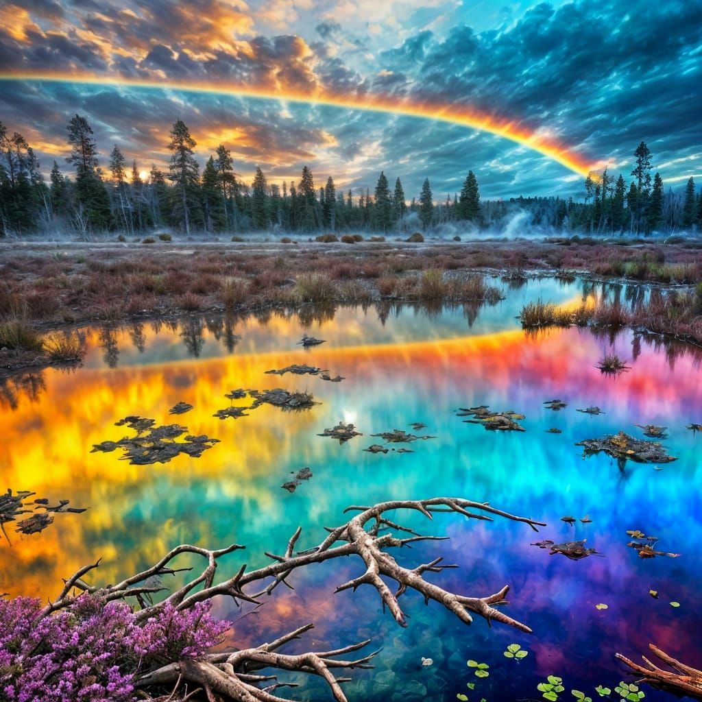 This image shows a close-up of a toxic bog, its oily surface shimmering with metallic colors. Dead trees rise from the water, emphasizing the scene's decay in a hyper-saturated style.