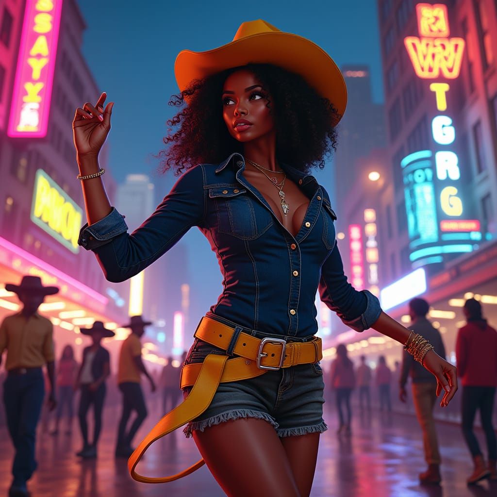 A stunning African American cowgirl with Afro-textured hair and bold fashion sense, set against a kaleidoscope of neon lights and city skyscrapers in a vibrant, hyper-realistic portrait.