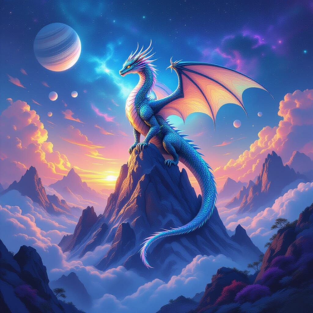 A majestic dragon with shimmering scales rests on a crystal mountain peak beneath a vibrant nebula sky. This digital painting features intricate details and glowing elements.