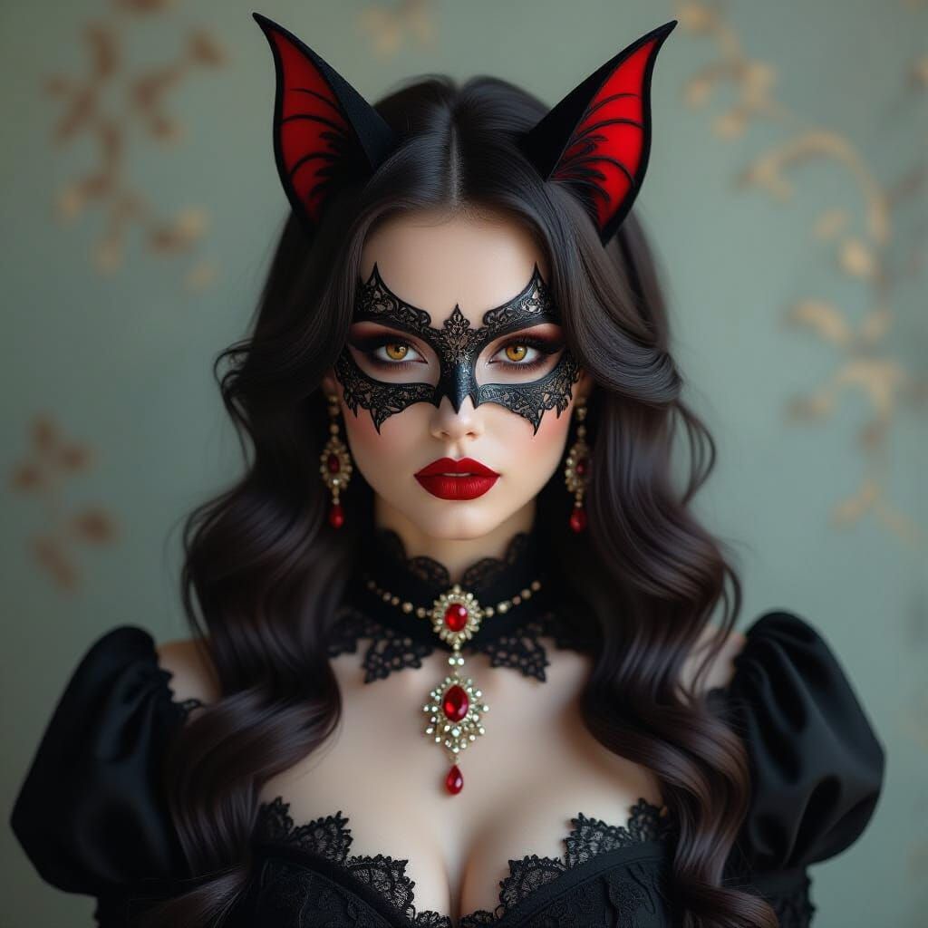 portrait of a Gothic fantasy character with long wavy black hair and big striking eyes. Her makeup is striking, with a dark eyeliner and touches of red. His head is adorned with a unique black bat-shaped mask, with bright red eyes, finely decorated with ornamental patterns. Her outfit is a dark and elegant ...