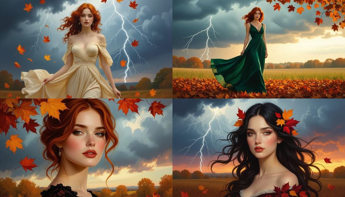 This image shows a realistic portrait of a romantic woman surrounded by autumn leaves, with a dramatic storm brewing in the background.