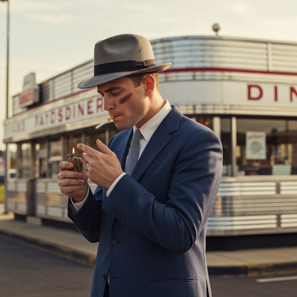 This image shows a veteran in 1950s attire outside a vintage American diner. The warm lighting and classic 50mm lens evoke a nostalgic, relaxed atmosphere of post-war America.