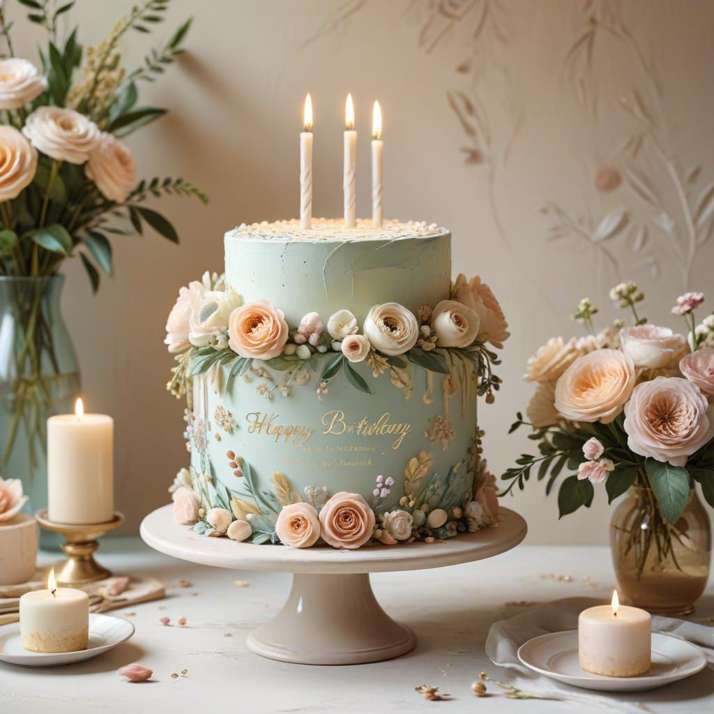 This image shows a beautifully illustrated birthday scene with an elaborate multi-story cake, lush flowers, and soft golden lighting, reminiscent of classic children's book art and elegant script fonts.