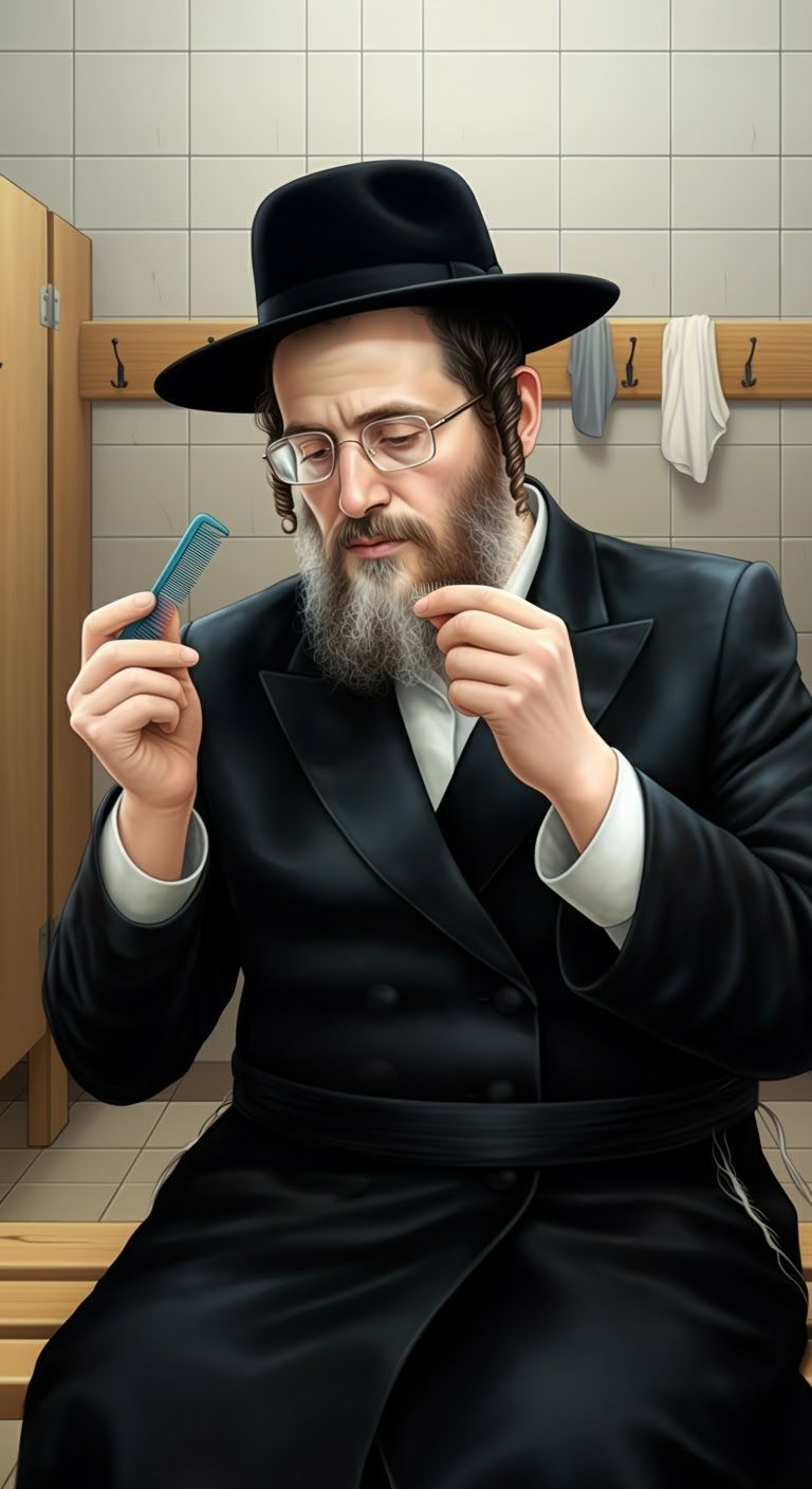 This image shows a Chassidic Jewish man meticulously grooming his payot in a mikvah dressing room. The digital illustration captures a realistic comic book style with careful attention to detail in the traditional setting.