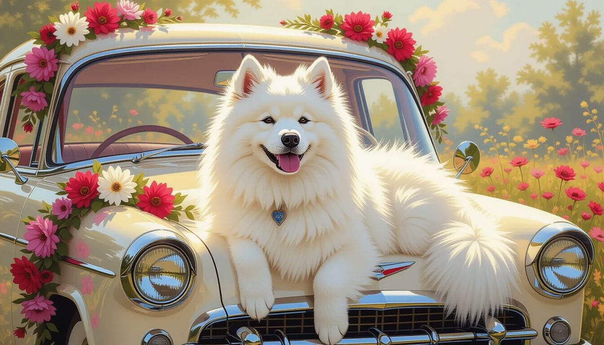 This image shows a fluffy white Samoyed dog sitting in a flower-adorned vintage car. The artwork evokes luminous landscapes with vibrant colors, natural tones, and meticulous detail.