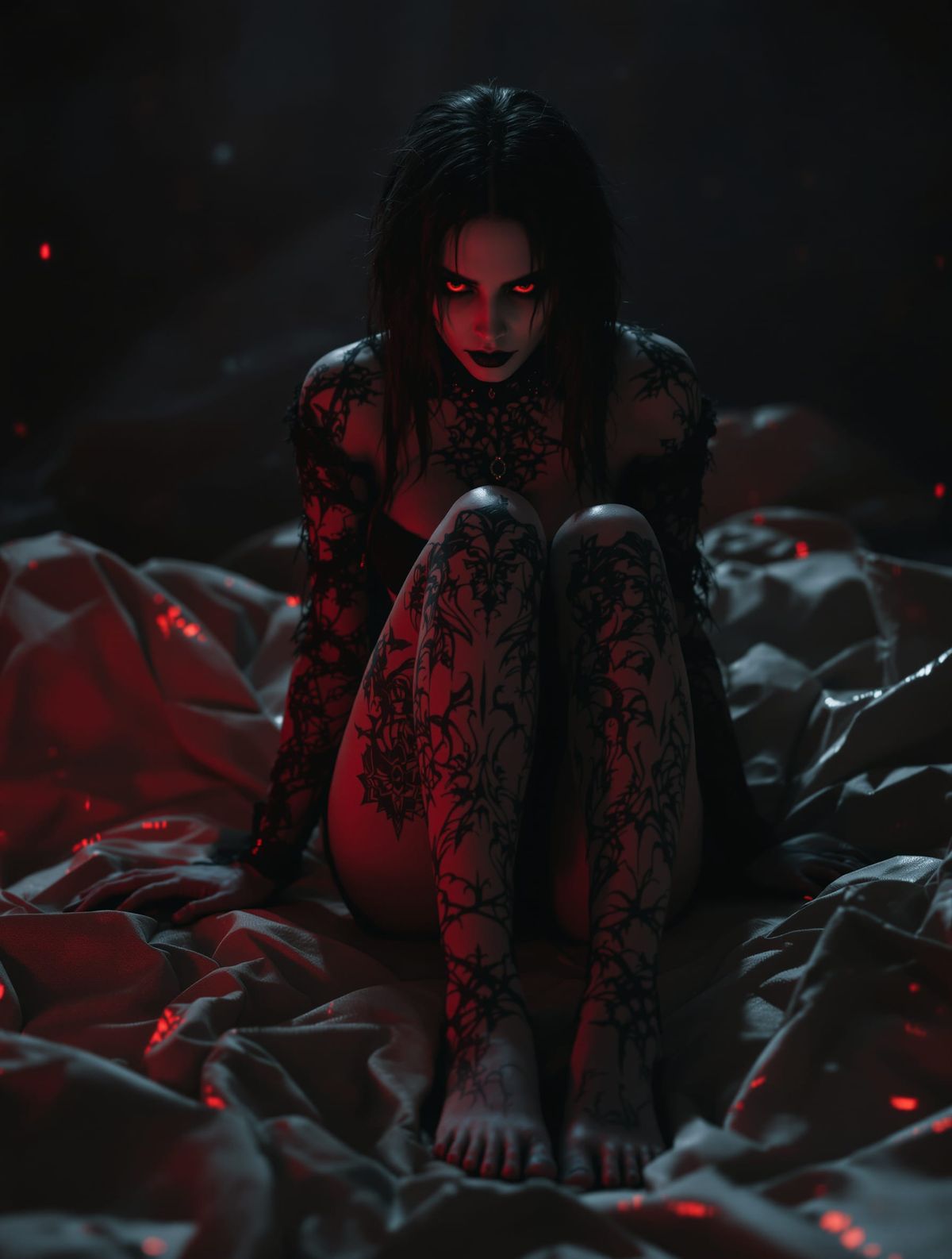 A hyperrealistic, cinematic image of a malevolent angelic vampire in gothic clothing, featuring intricate tattoos and dramatic lighting. The scene evokes horror and gothic romance with a rich dark color palette.