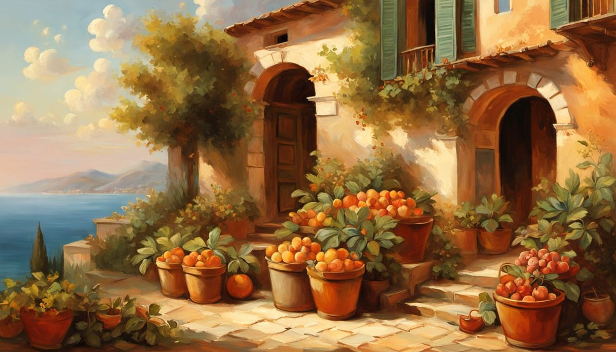 This idyllic scene depicts a Mediterranean fruit stand bathed in warm sunlight, with lush greenery and vibrant, juicy fruits set against a backdrop of terracotta pots and worn wooden crates, all captured in soft, loose brushstrokes and a warm color palette.