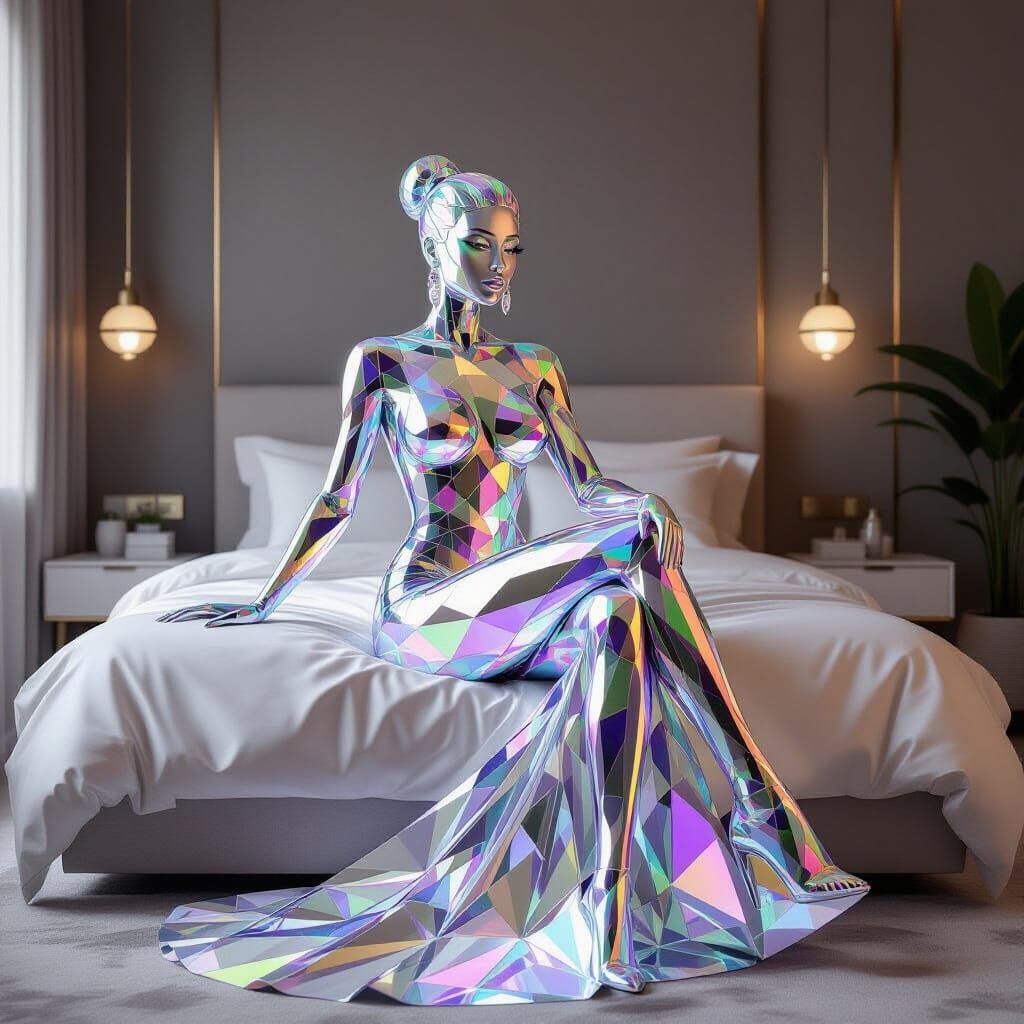 A striking picture of a futuristic woman composed of iridescent crystal sitting on a bed. The digital artwork features refractions of light across her prismatic, humanoid form in an elegant bedroom.