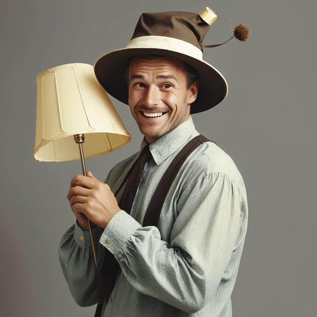 This image shows a vintage photograph of a man with a lampshade on his head and a funny smile. The man is wearing a long-sleeved shirt in this old-fashioned photo.