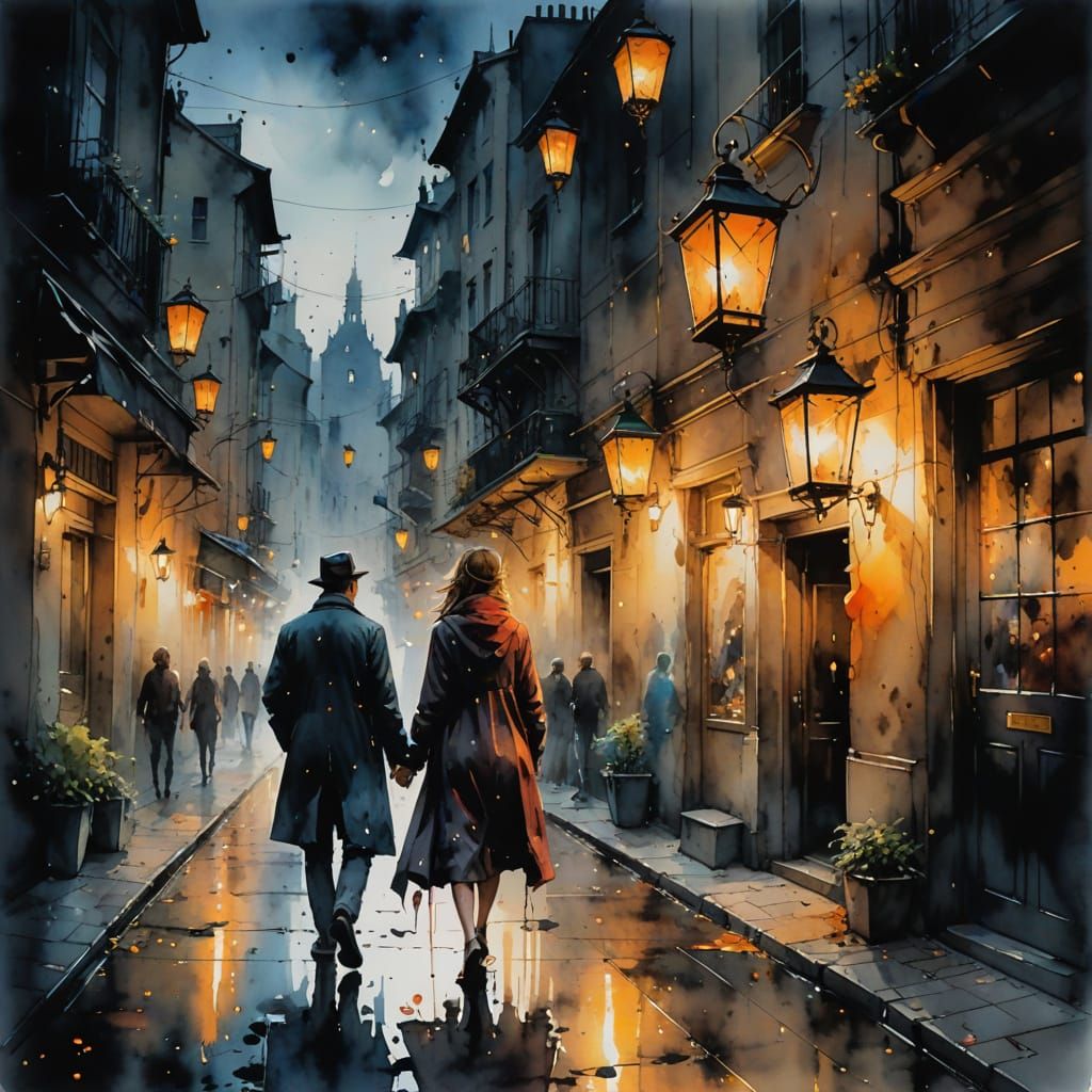 This image captures winding stone streets illuminated by flickering lanterns, with a mysterious figure vanishing into shadows. It features a stylised watercolour effect with splashy dark elements.