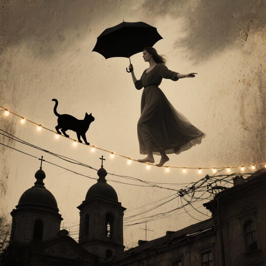 A surreal image of a woman in a long dress balancing on string lights over a European cityscape. Features cats, tangled wires, and a moody, vintage photo aesthetic.