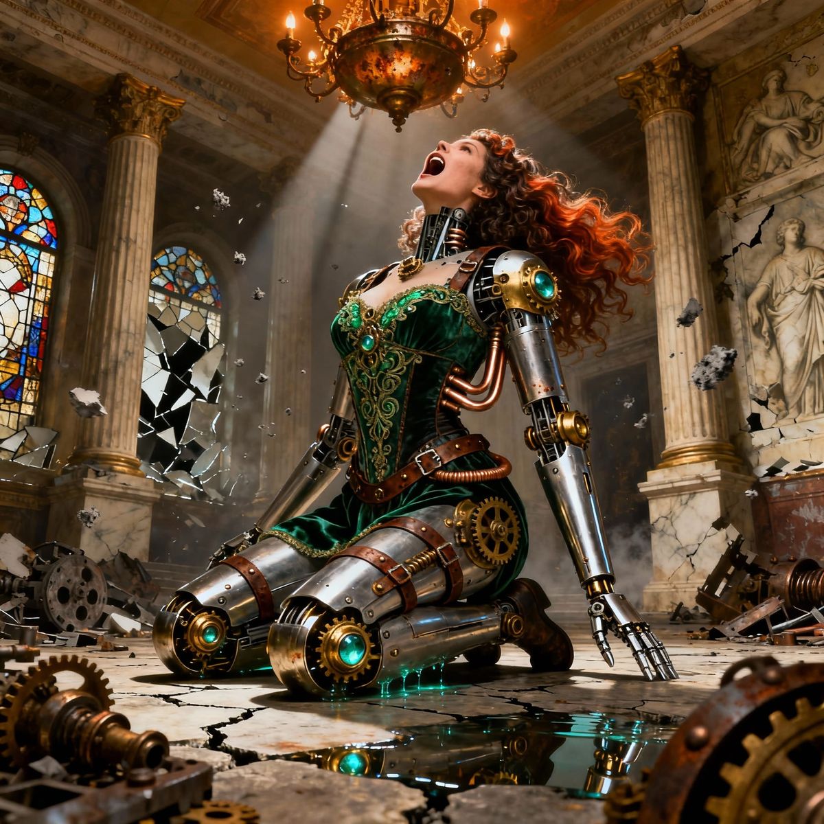 A highly detailed, photorealistic image of a cyborg woman in steampunk and fantasy style, kneeling in anguish in a grand hall. Warm light highlights her metallic features and ornate bodice.