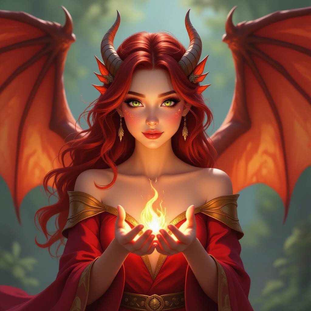 Милая, но страстная девушка-полудракон, в облике которой сочетаются нежная красота и огненная мощь. Внешность отражает двойственную природу: беззащитность и силу, нежность и страсть.
