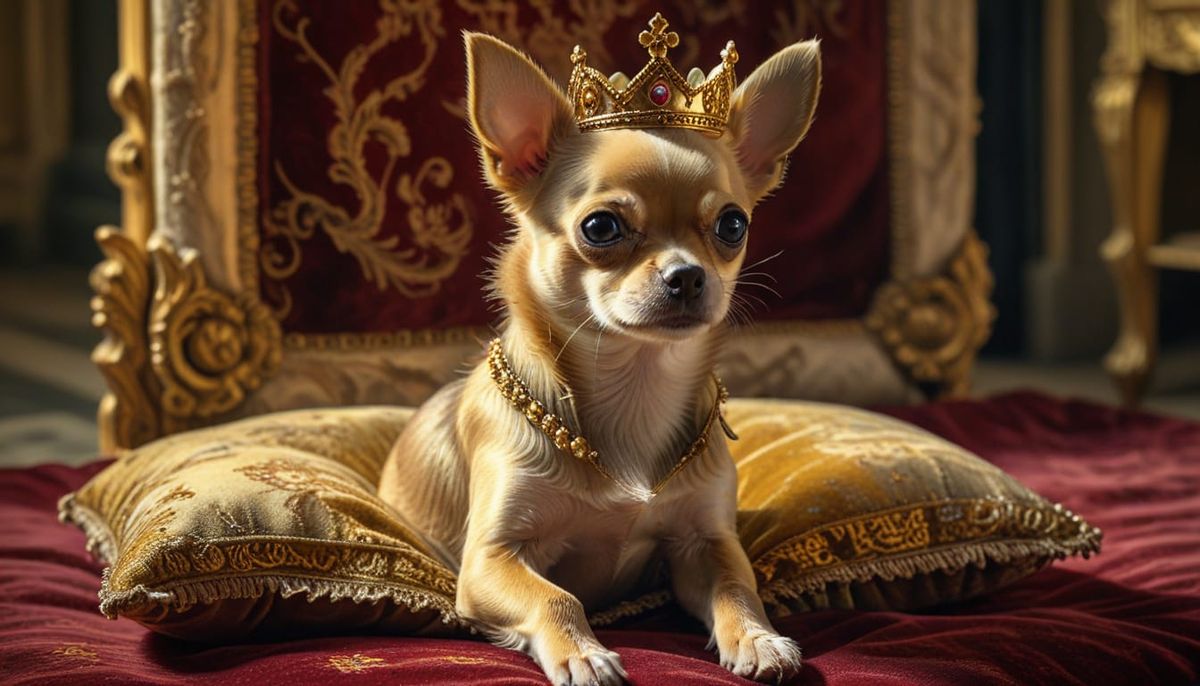 A watercolor style image of a crowned chihuahua puppy sitting on a velvet cushion inside a royal palace. The artwork features warm golden lighting and deep shadows in a hyperrealistic style.